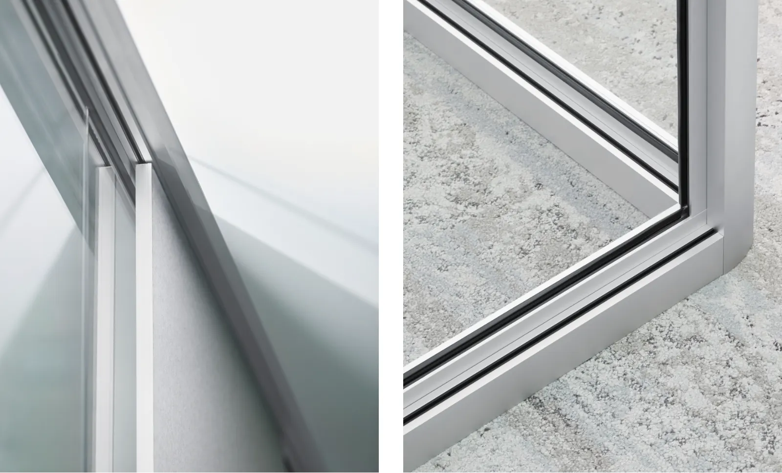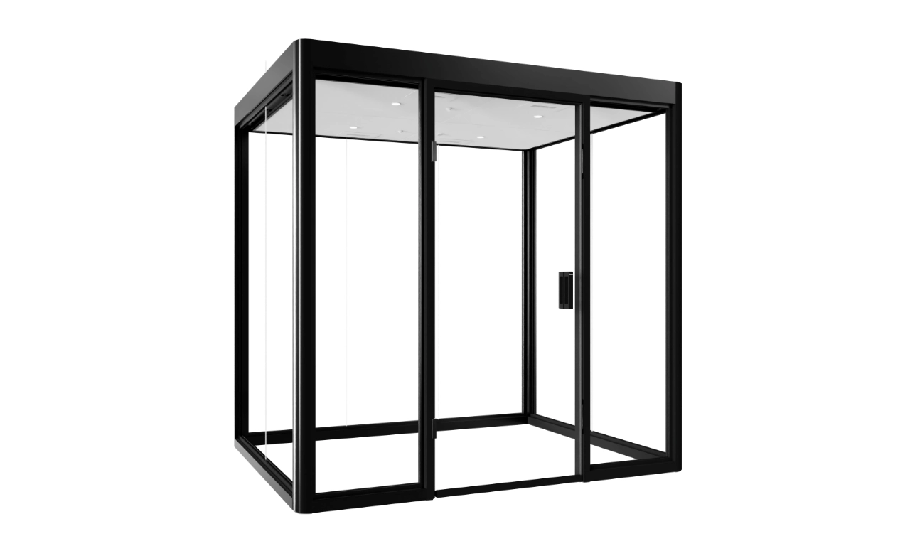 – Structure de cadre au design minimaliste en aluminium naturel ou anodisé noir. Panneaux en verre feuilleté de sécurité VSG-SI de 12 mm d’épaisseur avec film d’insonorisation Silence intégré. – Assemblage par collage invisible et facilement détachable.